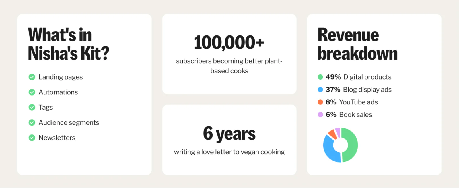 Nisha Vora quadrupled her email subs to 100,000, launched a New York Times bestselling cookbook, and scaled her creator business to four income streams. In addition to her book sales, Nisha has a meal plan subscription, display ads on her blog, and YouTube ad revenue.