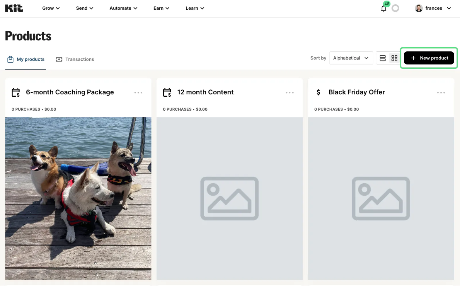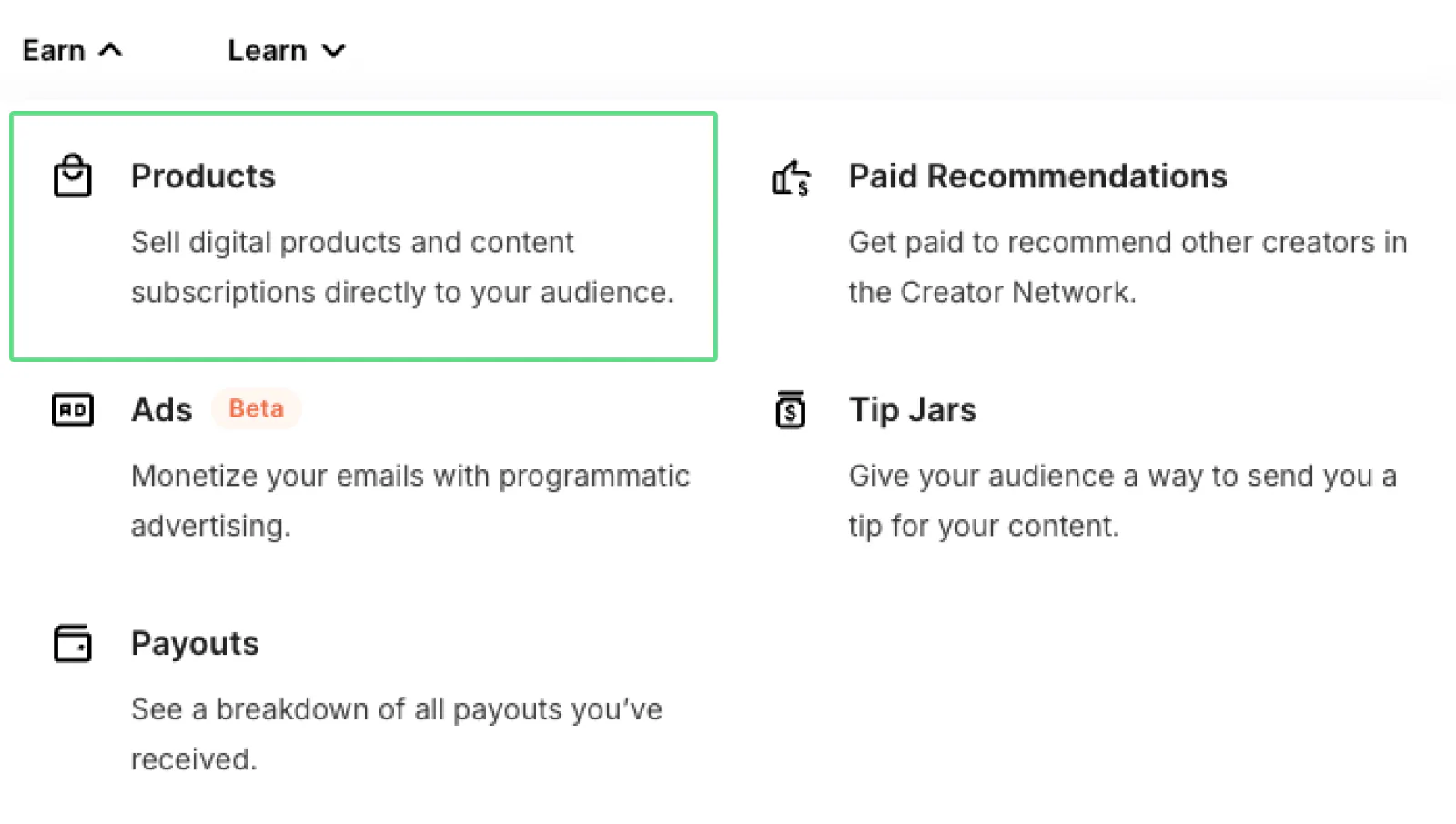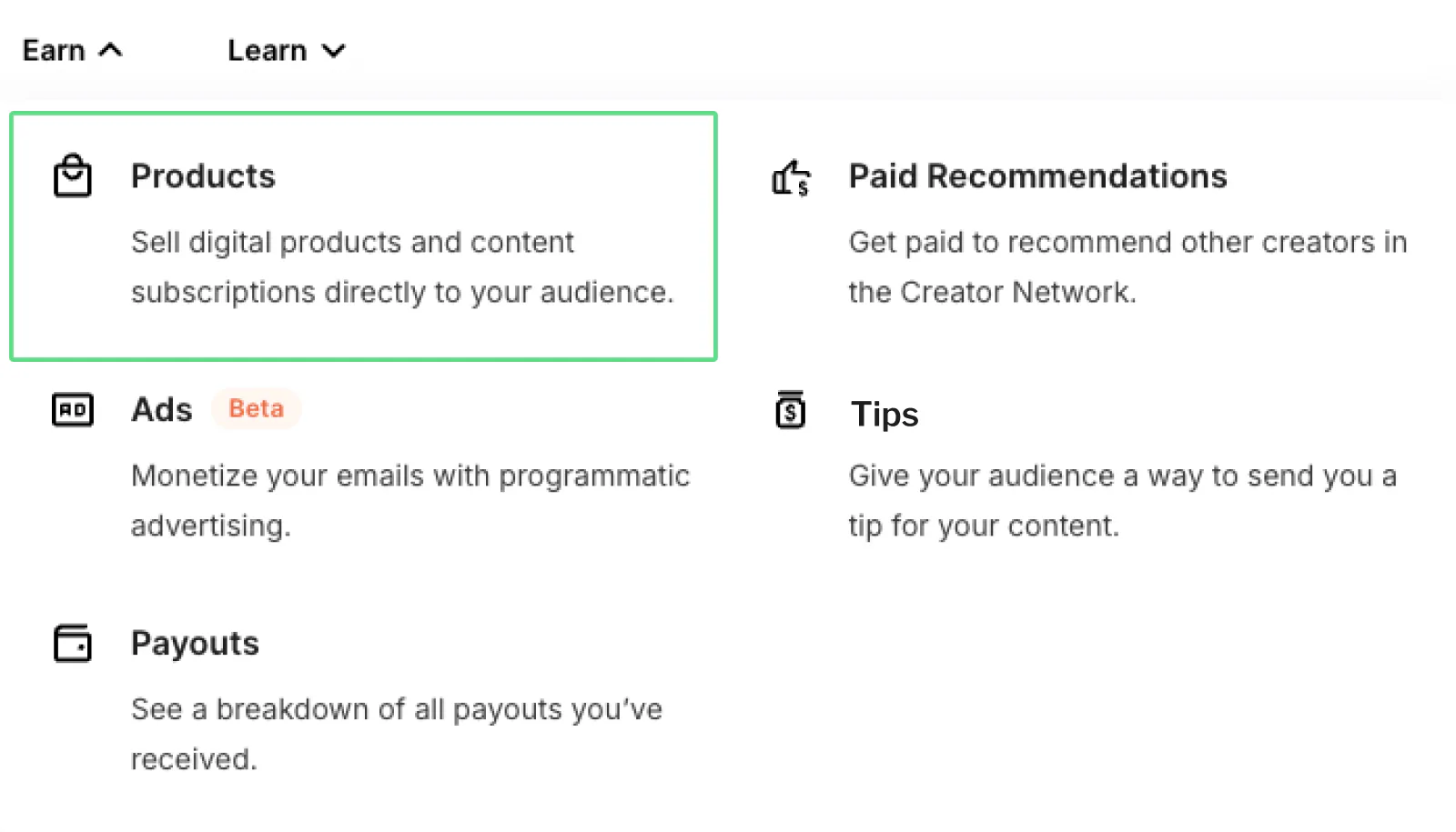 To do this, you’ll need to create a Kit account or sign in. Then, navigate to Earn > Products.