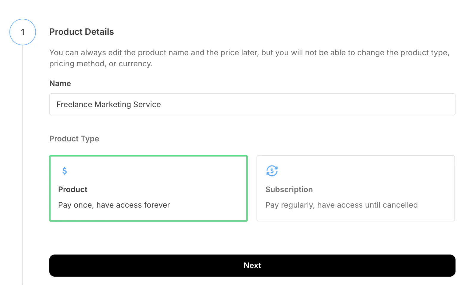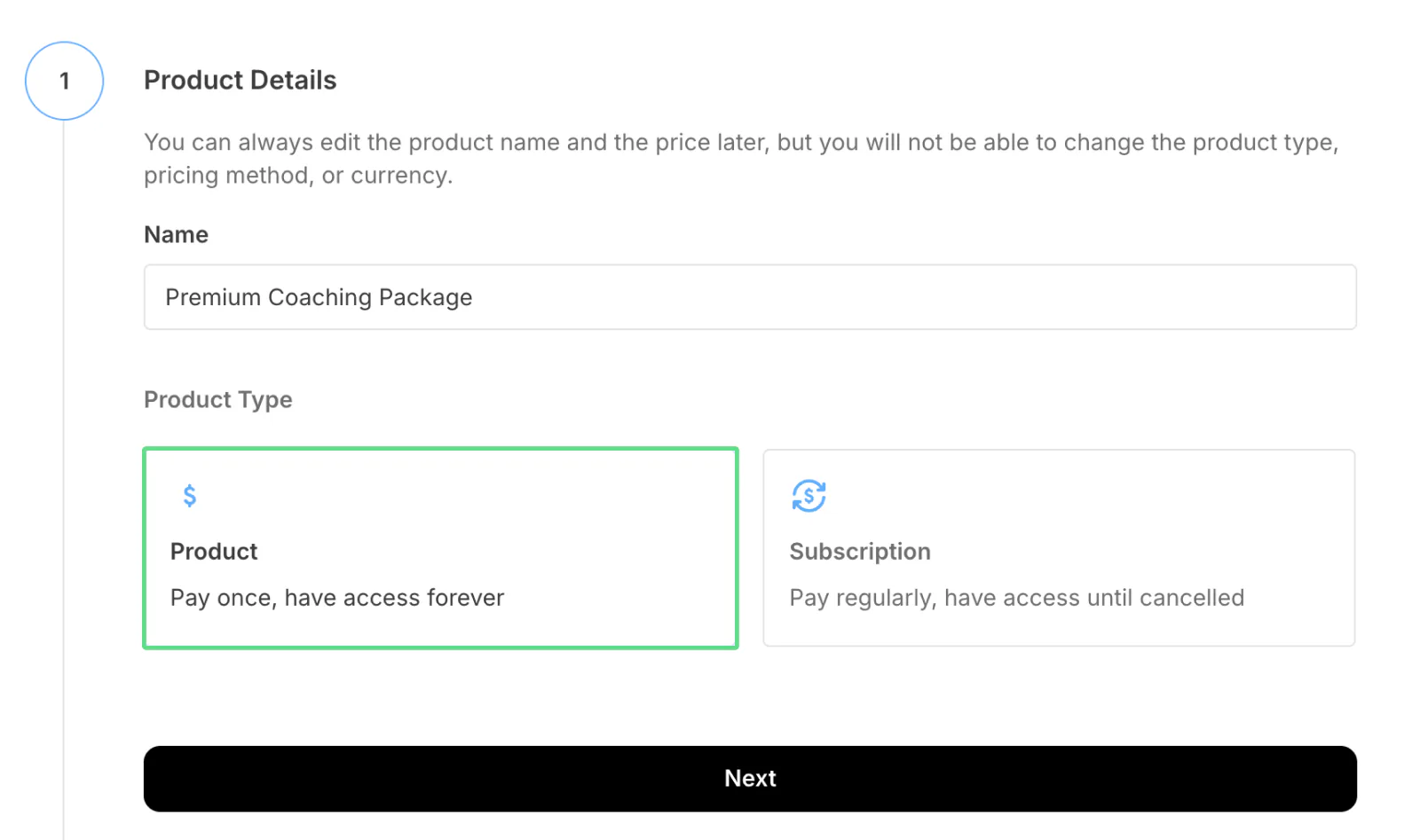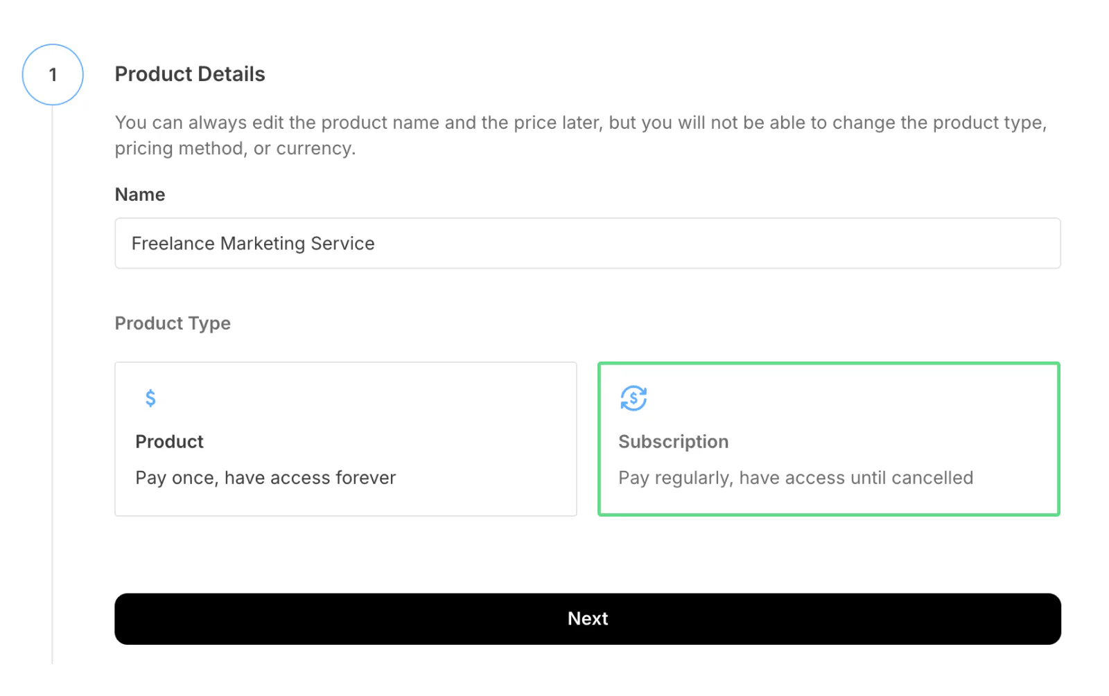 Enter your product name and choose between selling the product once or via a subscription. Click Next.
