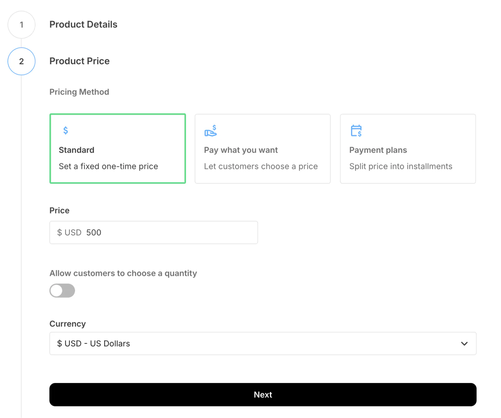 Select the pricing method: a one-time, fixed price, pay what you want, or a payment plan. Then, enter the price and choose the currency. Click Next.