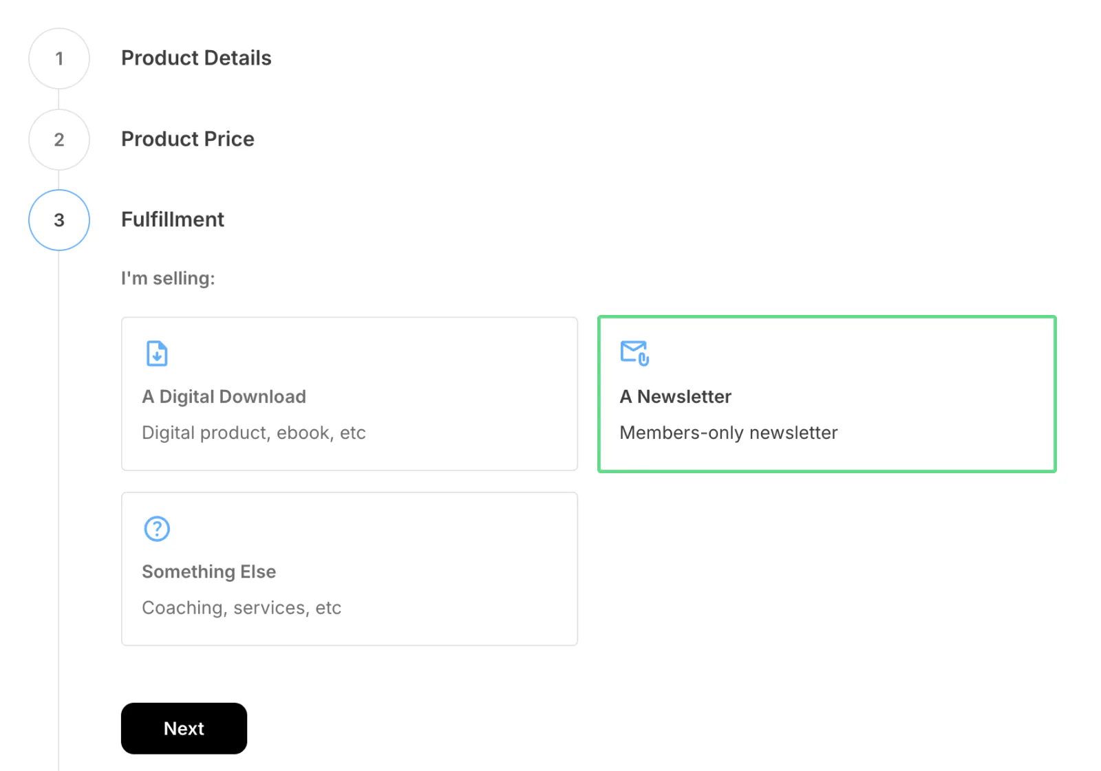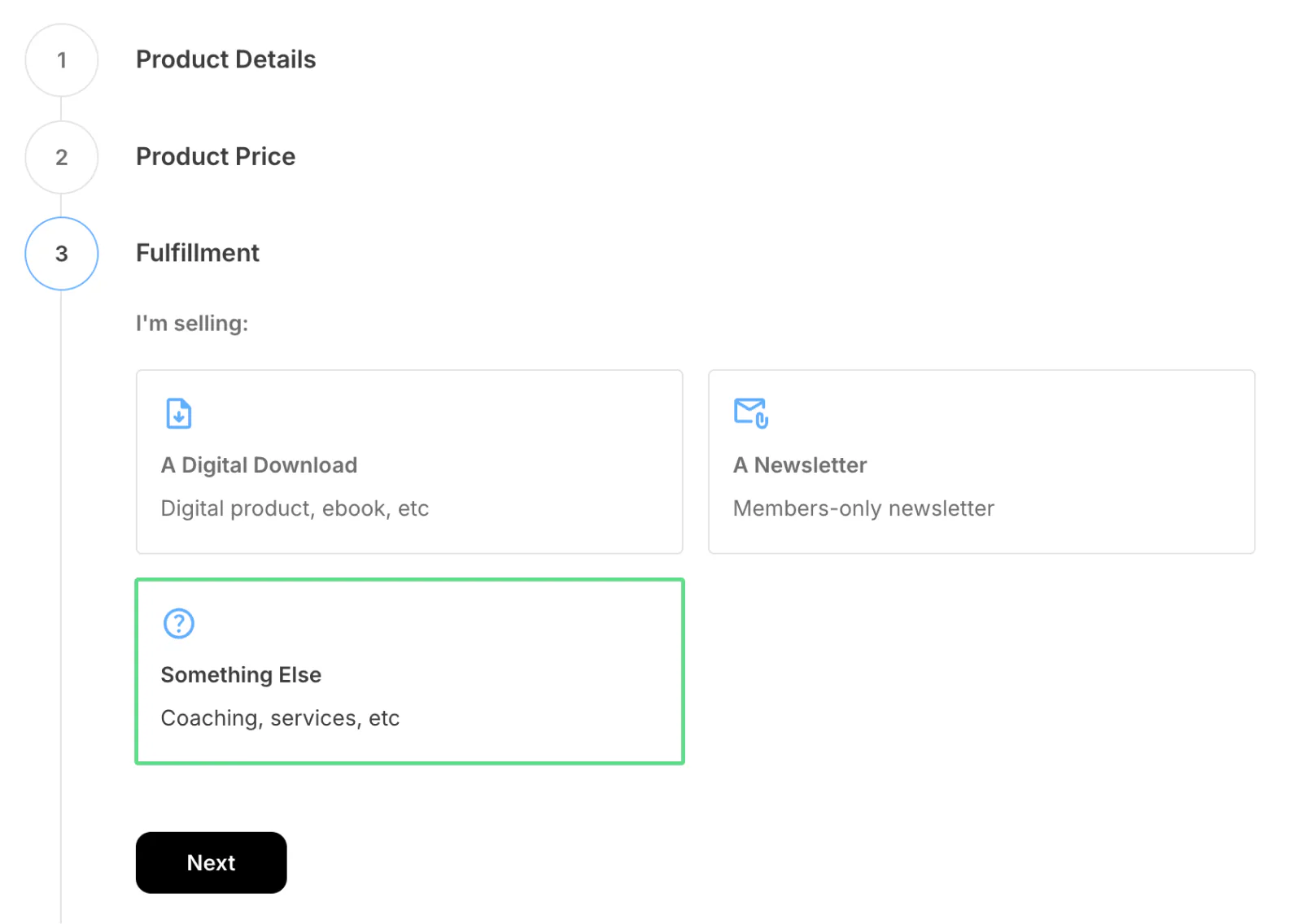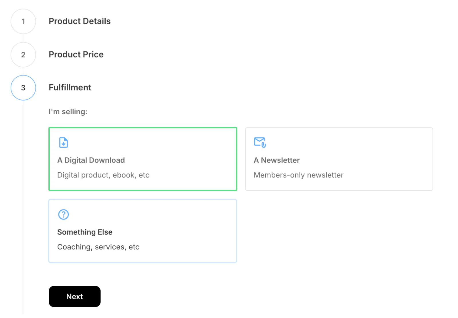 Choose the product category: digital download, newsletter, or something else (i.e., coaching, professional services, etc.) and upload any relevant files. Then, click Next.