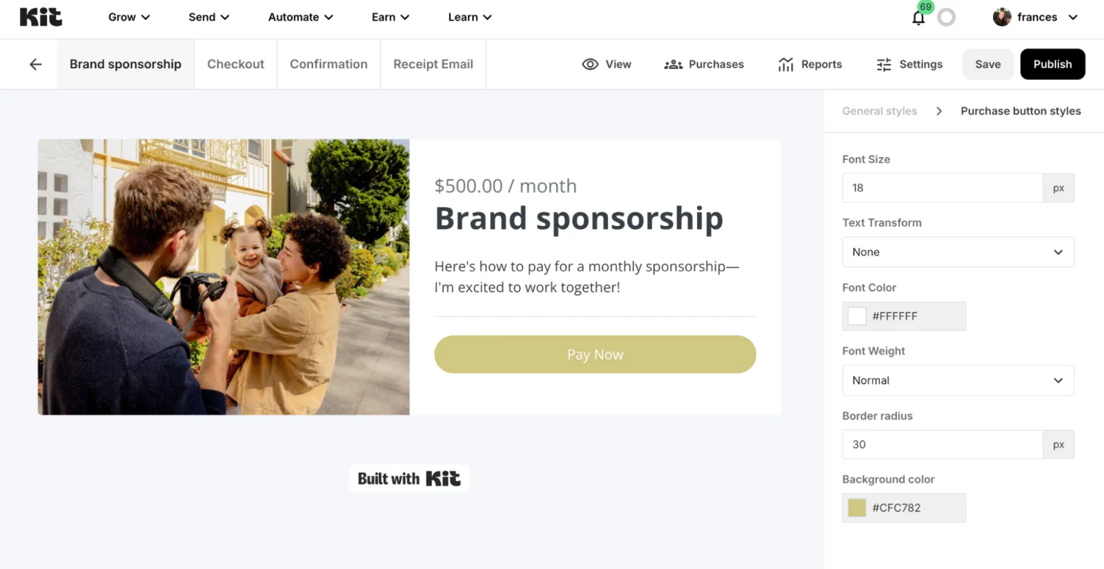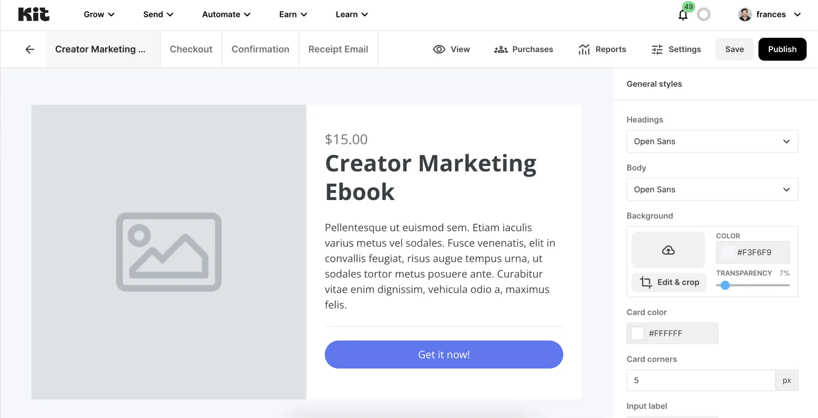 On the following page, you can edit the title and product description of your sales page, plus adjust the colors and fonts to match your branding. When you’re ready, hit Publish to start selling your digital product.
