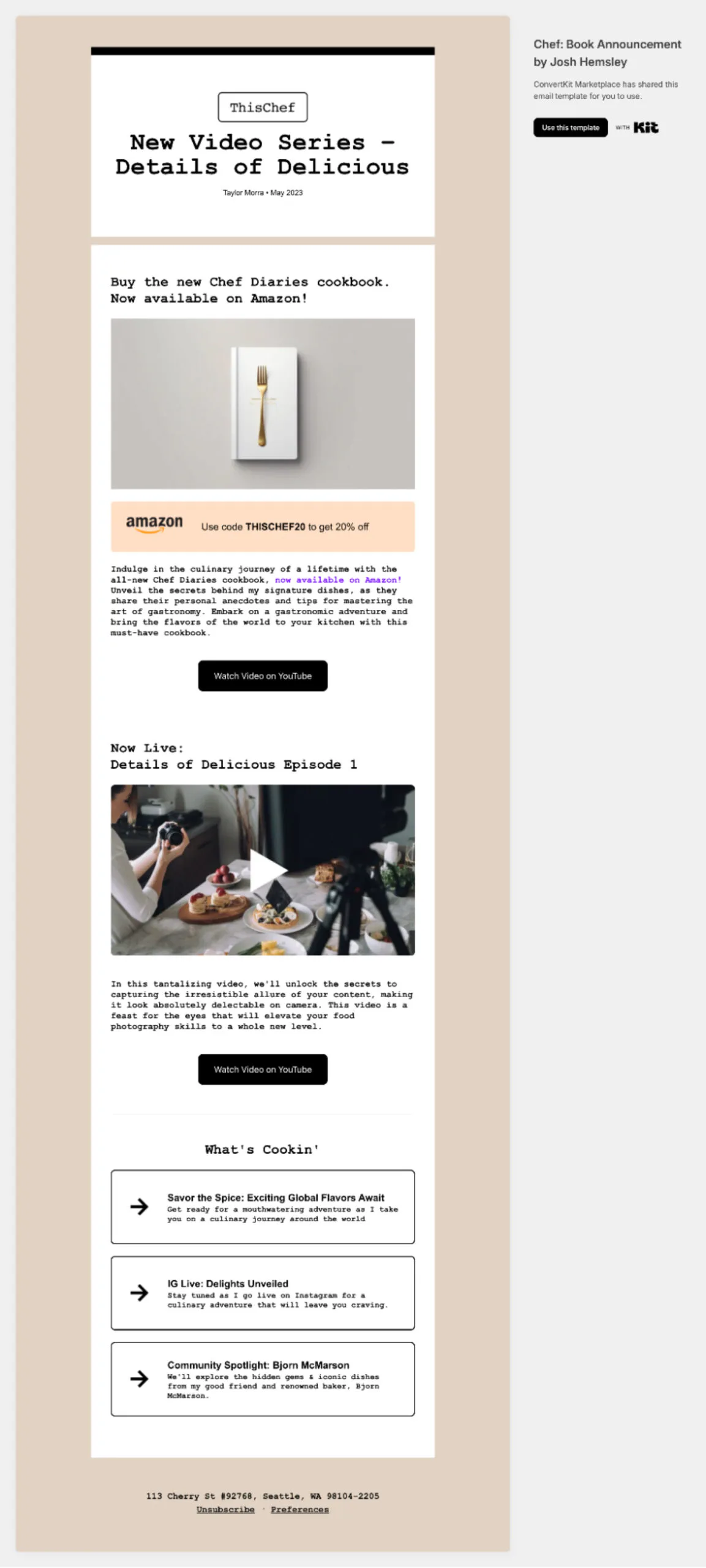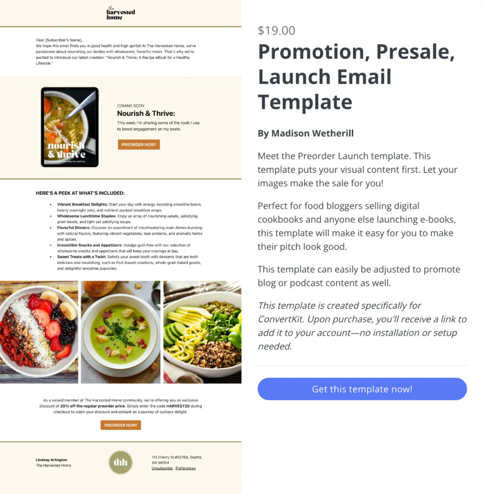 If you need help with email design to get the word out about your new digital product, check out the Kit Marketplace for beautiful templates made just for creators. Madison Wetherill’s product launch template is perfect for promoting your new ebook, cookbook, template, or download.