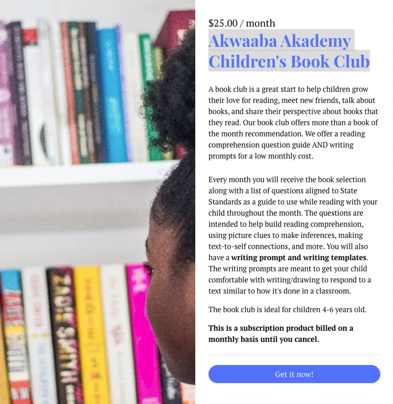 The Akwaaba Akademy hosts book clubs for children ages 4-6. Each month, they deliver the book selection with state-standard questions to help kids get the most out of each book. Host Odessa is a kindergarten teacher who also offers tutoring services for kids.