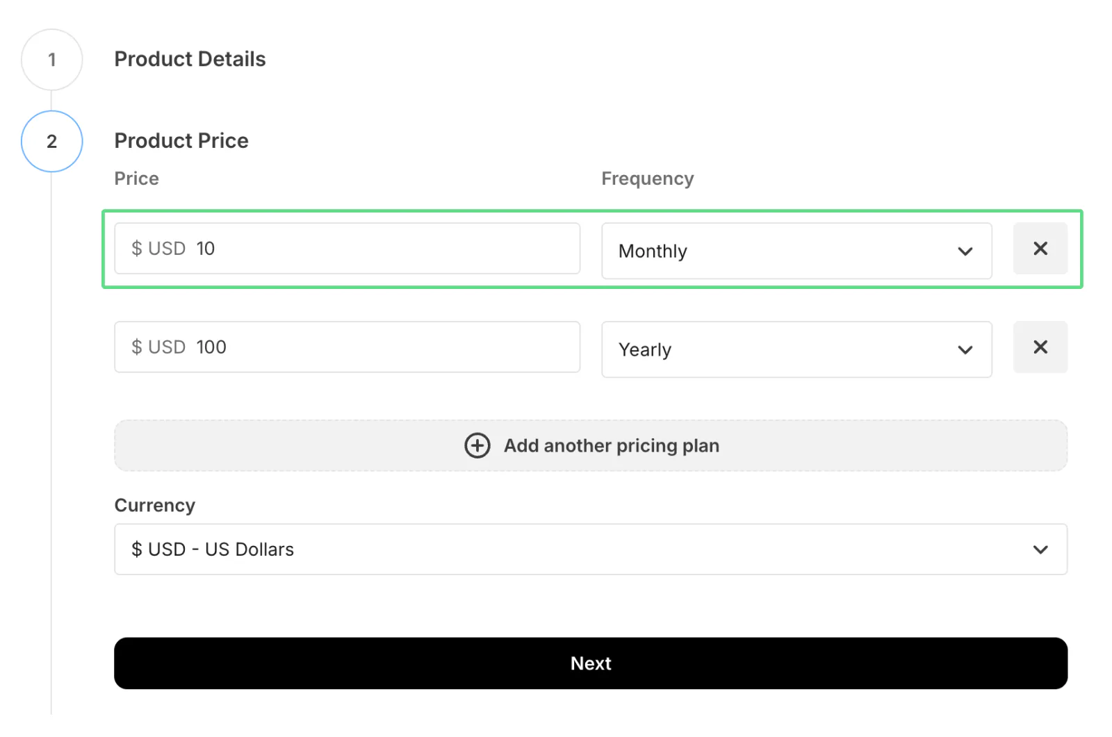 Enter the price and select the frequency: monthly, quarterly, or yearly. You can add multiple pricing plans, such as a monthly and annual price. Confirm your currency and click Next.