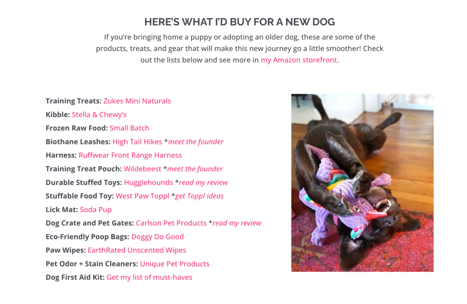 Tori Mistick, founder of Wear Wag Repeat, has a dedicated page for her favorite dog products. Her audience learns about items from a trusted source, and Tori earns 10% of her revenue from the affiliate links. It’s a win-win.