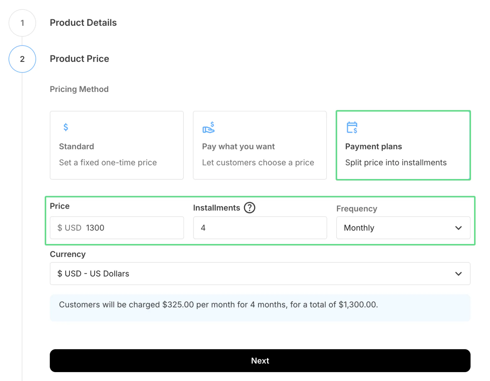 Select the pricing method: a one-time, fixed price, pay what you want, or a payment plan. For this example, we chose a high-ticket offer split into a monthly payment plan. Then, enter the price and choose the currency. Click Next.