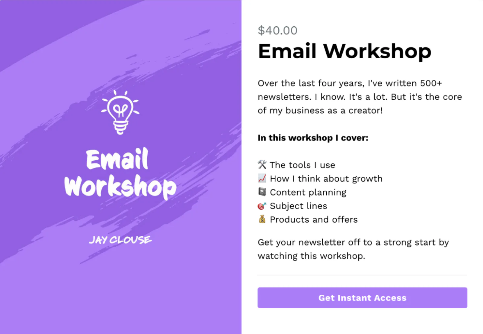 Jay Clouse uses a landing page to promote on-demand workshops and add subscribers who want to hear about future events.