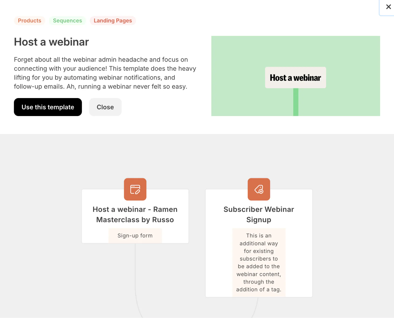 Our free webinar email automation makes promoting a workshop or event to your email list easy with a connected landing page, product, and email sequence. Use this automation to remind subscribers about an upcoming live workshop or event.