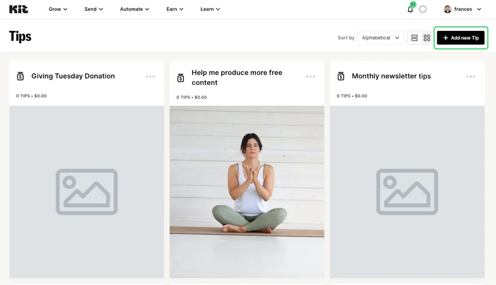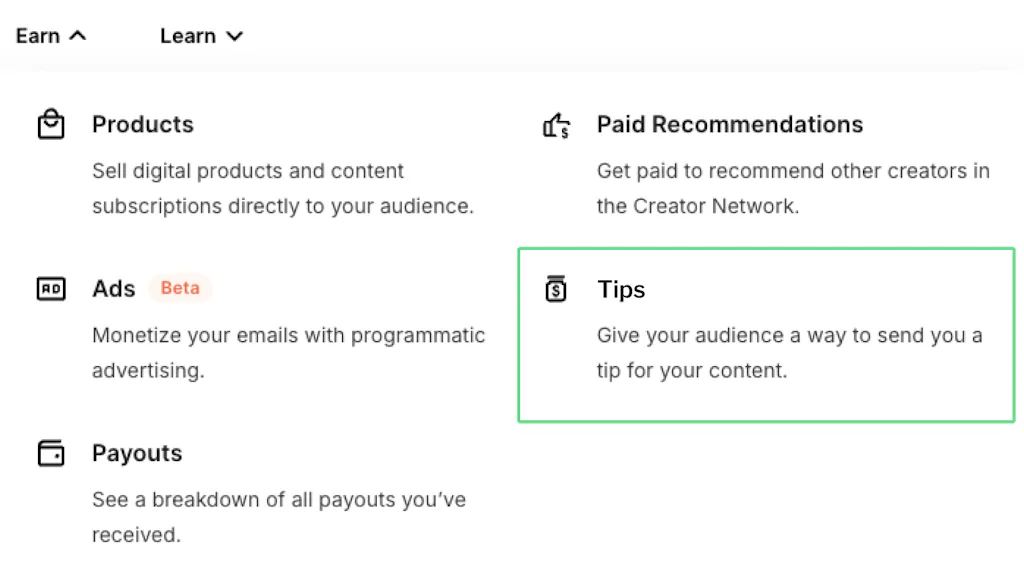 The first step to setting up a virtual tip jar in Kit is to sign in or join. Then, navigate to Earn > Tips.