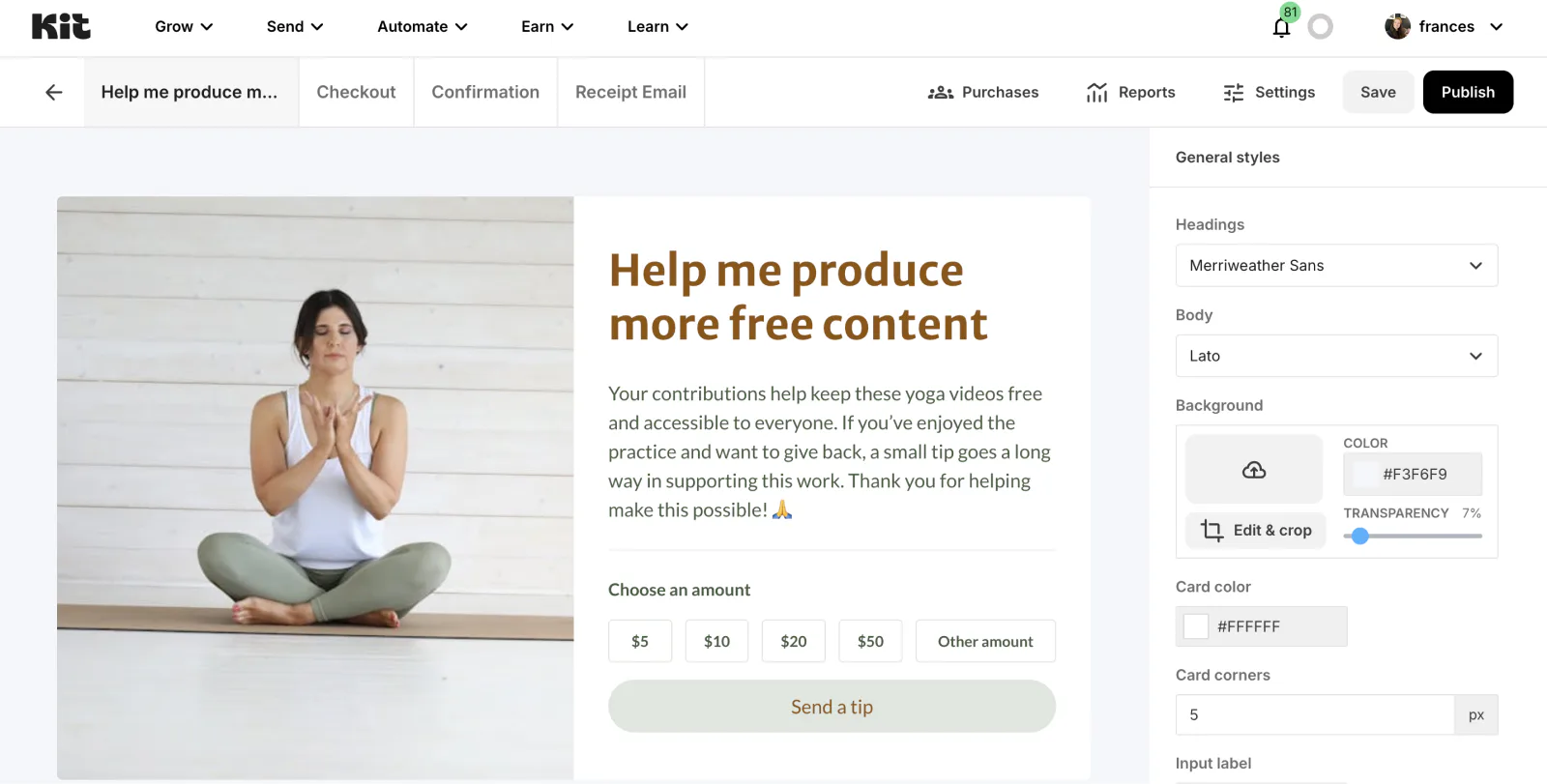 Customize your digital tip jar product page by uploading or choosing a photo, perfecting the color palette, and adding some text. Click Publish.