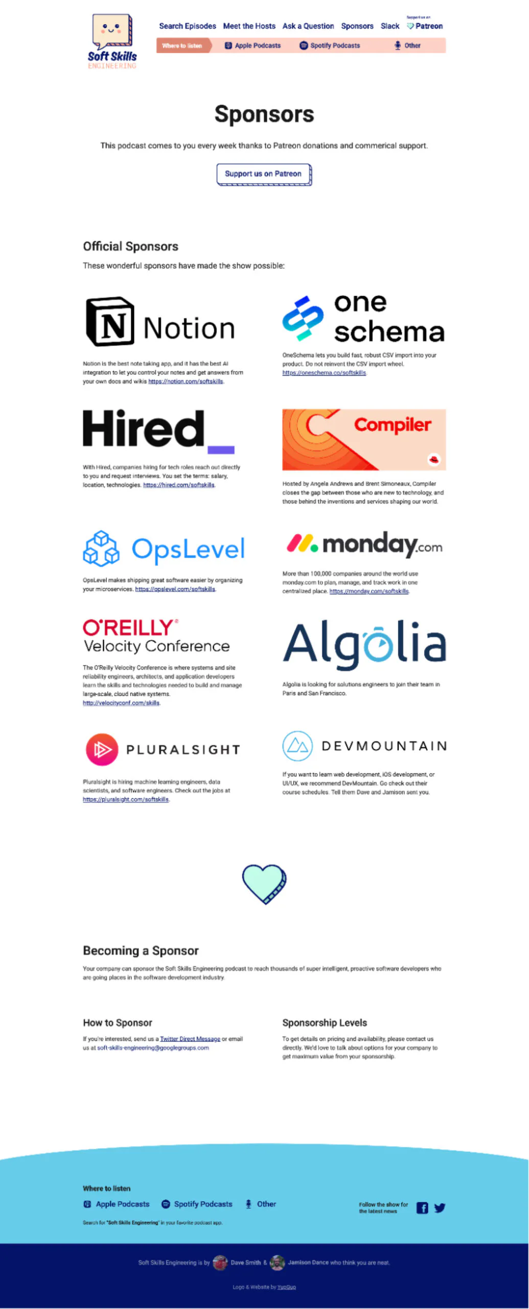 Creating a sponsor hub on your website lets you share brands with your audience and tell other brands how to contact you. Image via the Soft Skills Engineering podcast.