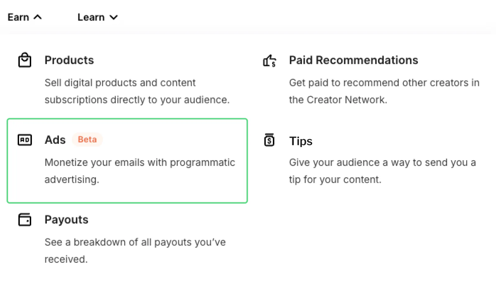 From your Kit dashboard, navigate to Earn > Ads.