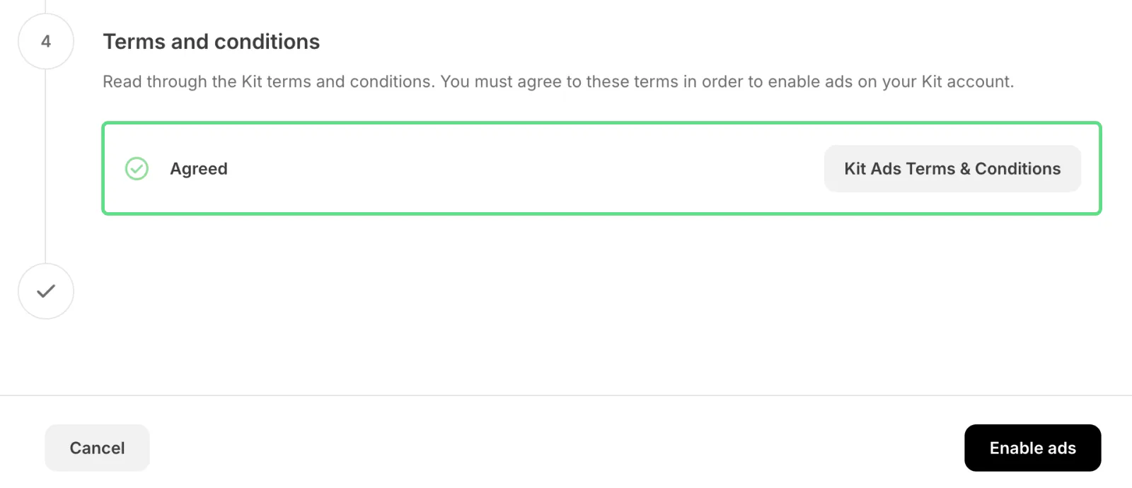 Read and agree to the terms and conditions by clicking Kit Ads Terms & Conditions. Then, click Enable Ads.