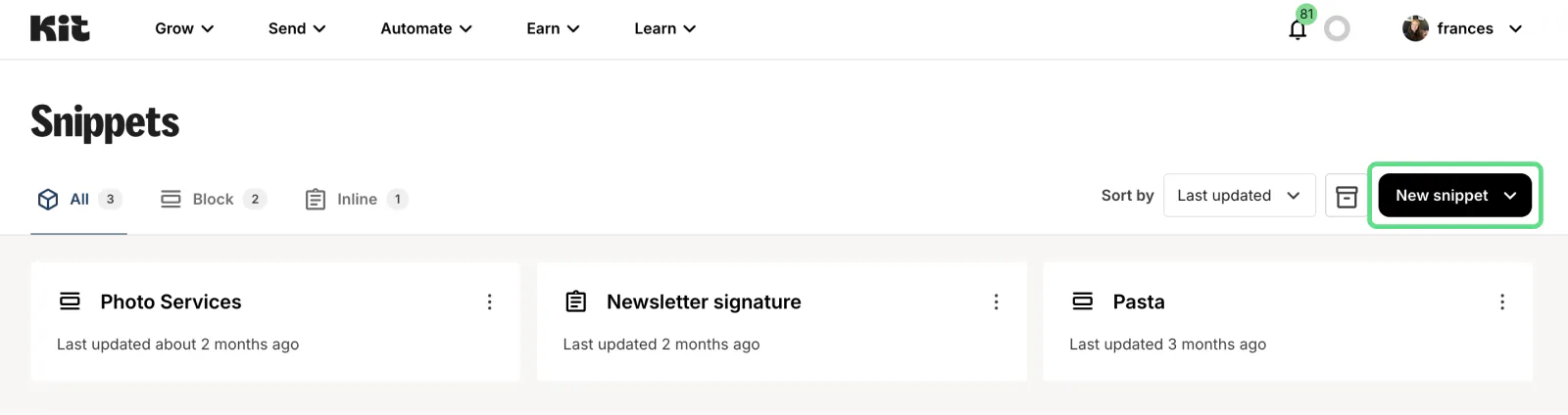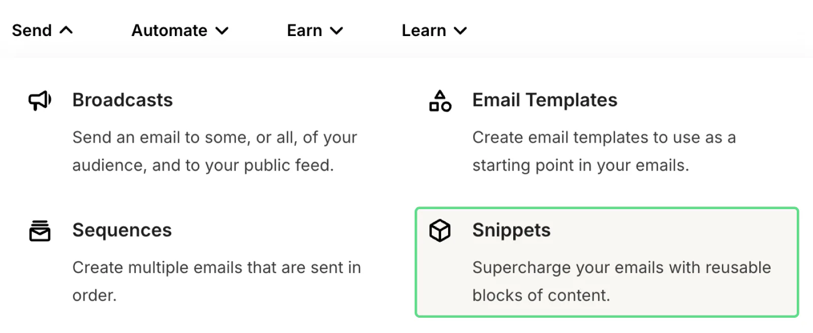 Sign into your Kit account (or join us if you haven’t already!). Then, navigate to Send > Snippets.