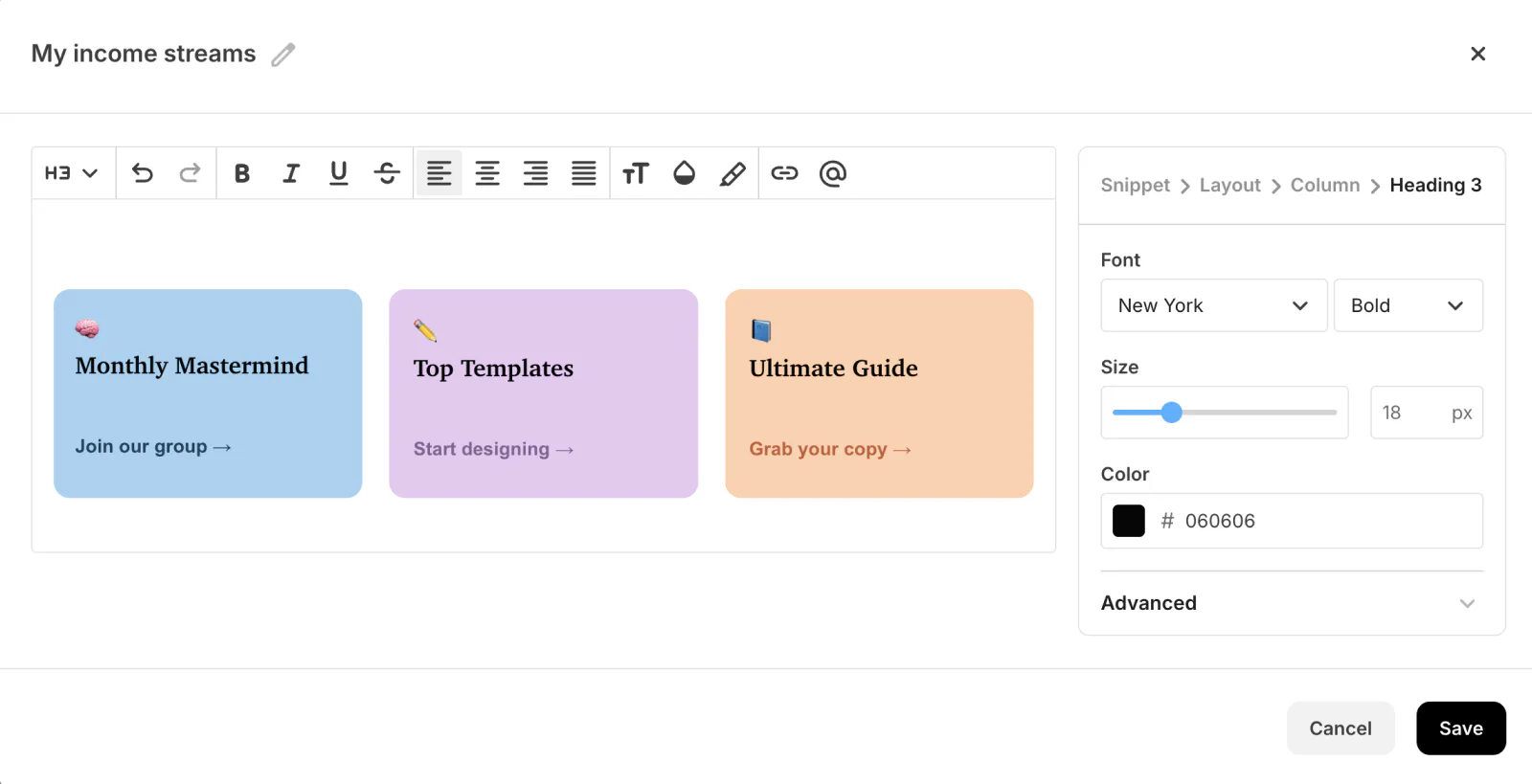 Enter a name for your snippet and then customize it with text, photos, videos, products, polls, and more. Click Save.