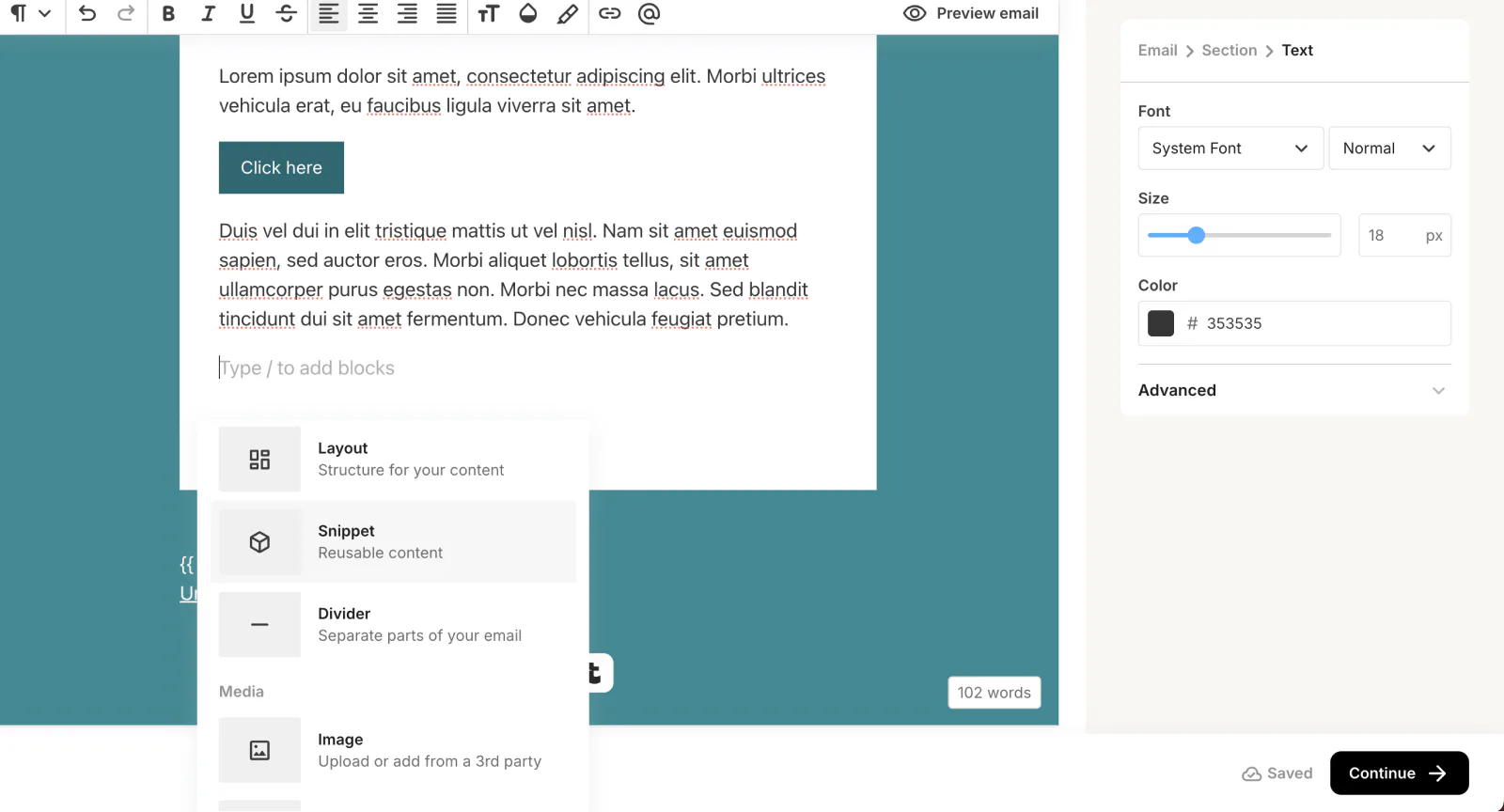 Add snippets to your Kit emails by clicking + in the email editor and choosing Snippet.